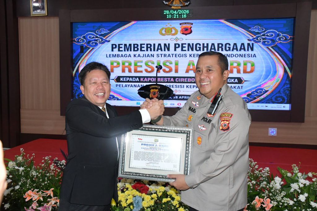Kapolresta Cirebon Kombes Pol Imara Utama, S.H., S.I.K., M.H., menerima penghargaan Presisi Award dari Lembaga Kajian Strategis Kepolisian Indonesia dalam sebuah kegiatan yang berlangsung di Aula Pesat Gatra Mapolresta Cirebon, Selasa (28/4/2026).