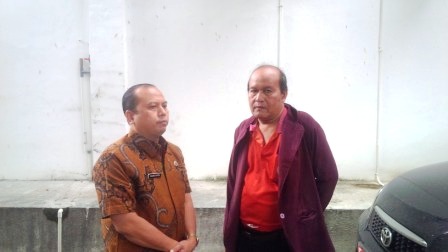 | Kepala Dinas Kependudukan dan Pencatatan Sipil Kabupaten Cirebon,Drs.H.Mochamad Syafrudin (kiri pakai batik coklat) bersama wartawan tabloid Gelombang, Subrata,SH ketika wawancara. |